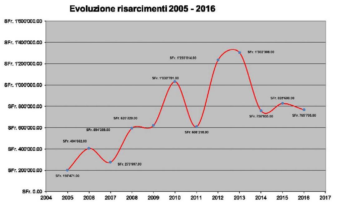 Qui un grafico sull'ammontare (in CHF) dei danni causati dagli ungulati in Ticino.